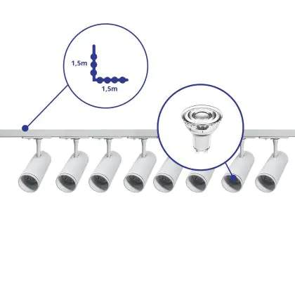 | Manufacturer Name | Complete L shaped 1-Phase Track Set White incl. 8x Spot fixture + GU10 2700K 3W Dim – 1,5 x 1,5 mete | |